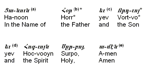 | The Sign of the Cross in English: The above includes a "word for word" Armenian to English translation of the Sign of the Cross. The following are the actual order of words in English: In the name of the Father, and of the Son, and of the Holy Spirit. Amen. |